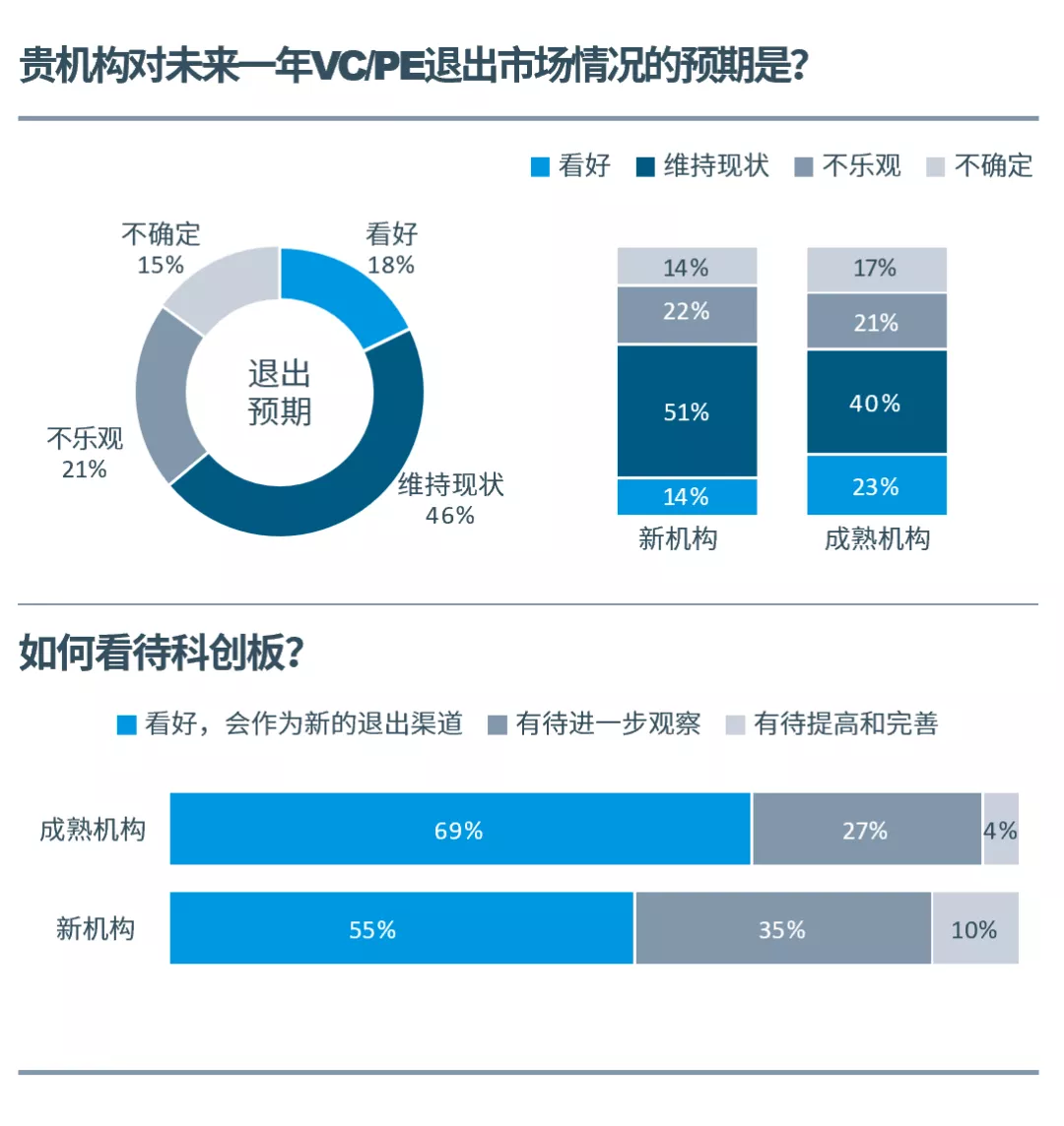 對2020年中國股權(quán)投資市場退出端“看好”和認為“維持現(xiàn)狀”的機構(gòu)共占到所有調(diào)研的64%。其中,看好退出環(huán)境的成熟機構(gòu)多于新機構(gòu);與此同時,成熟機構(gòu)也更看好科創(chuàng)板,兩者具有一定相關(guān)性。反映出成熟機構(gòu)退出壓力加大,十分渴望國內(nèi)退出市場建設(shè)改革 。