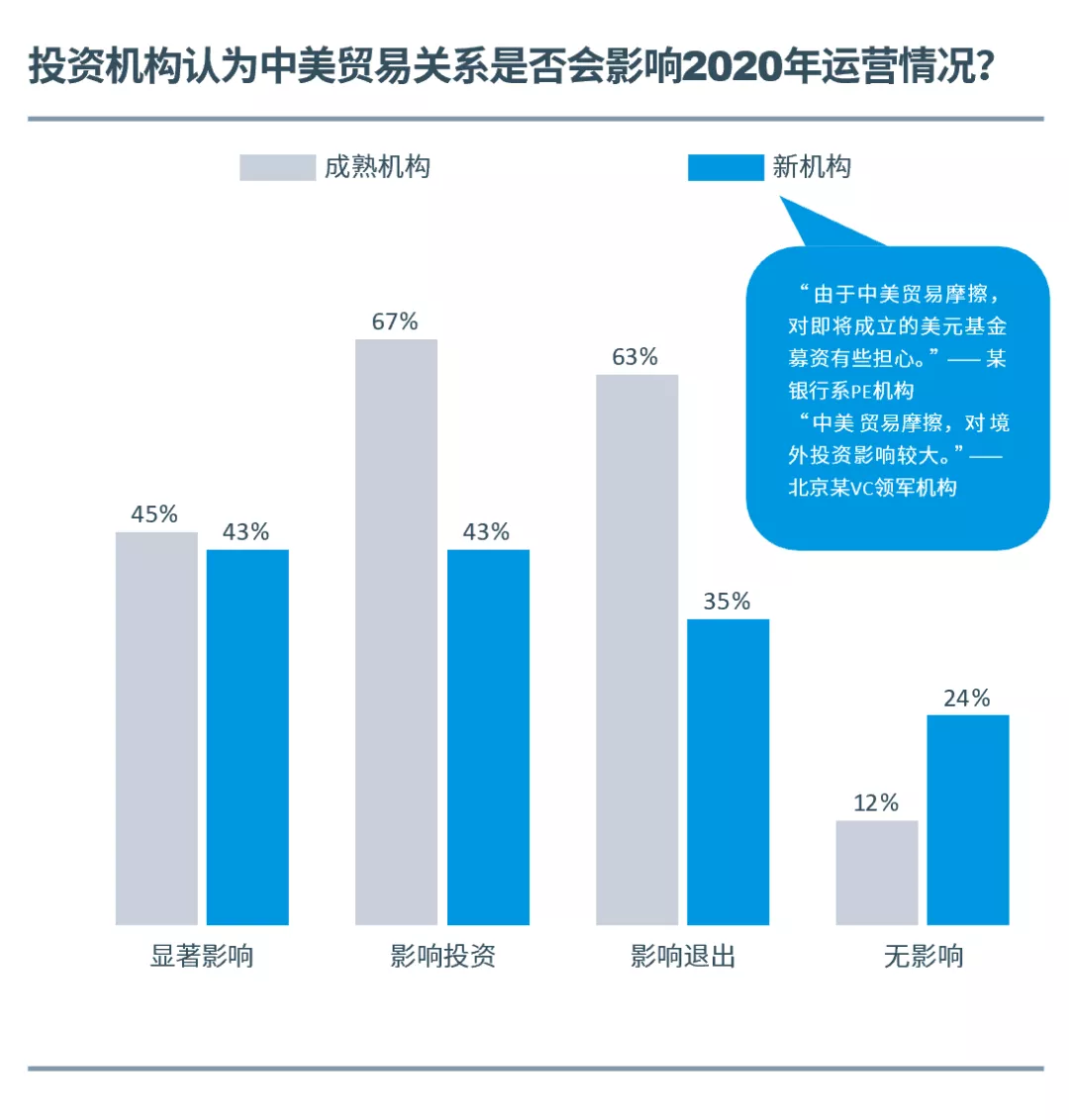 對于中美貿(mào)易關(guān)系對于2020年機構(gòu)運營的影響,成熟投資機構(gòu)與新投資機構(gòu)的擔憂程度略有差異。成熟機構(gòu)對“貿(mào)易摩擦影響投資/退出”的擔憂更明顯,而新機構(gòu)認為“無影響”的比例更大。