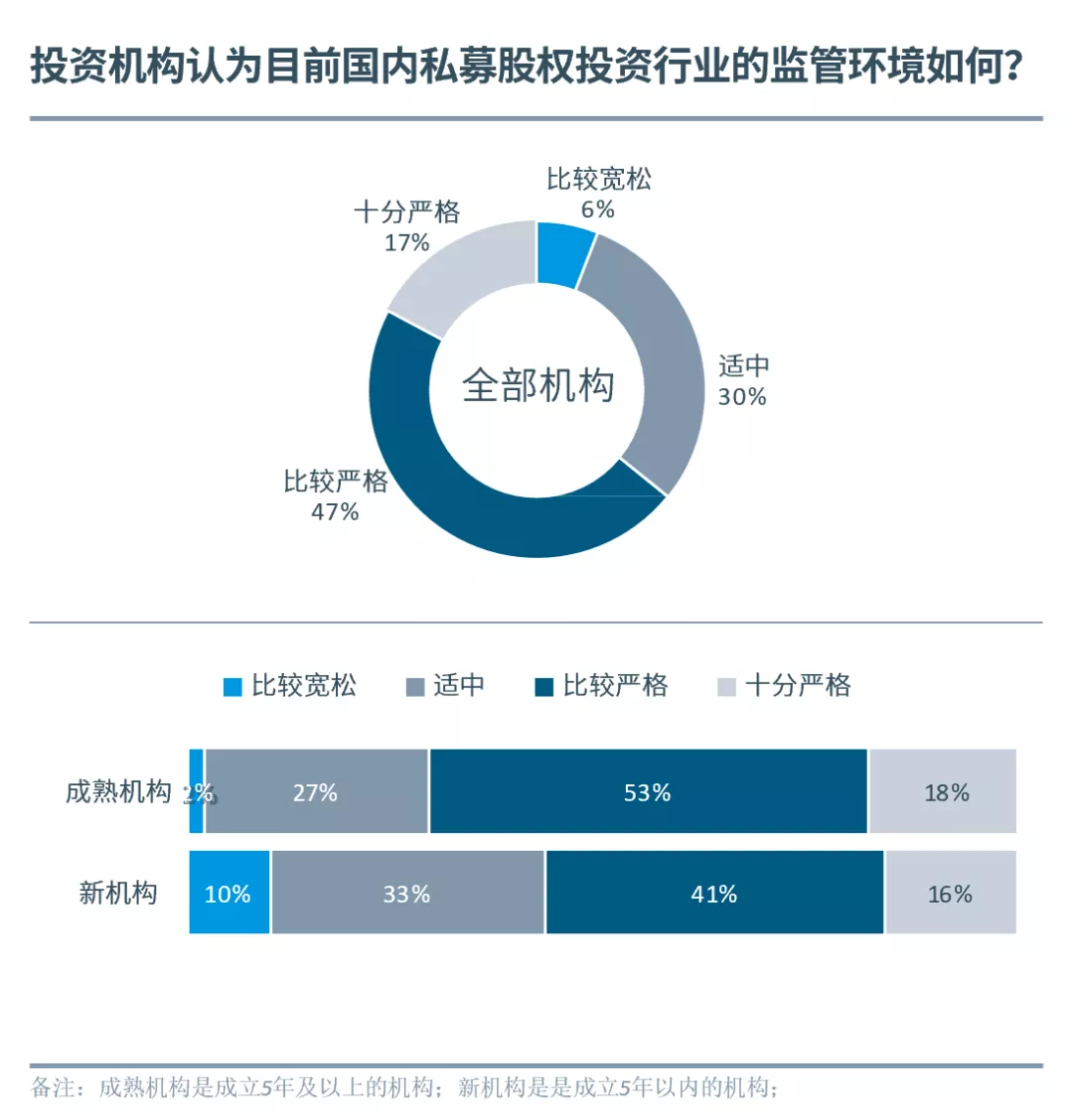 64%投資機構(gòu)認為國內(nèi)當前私募股權(quán)投資行業(yè)監(jiān)管嚴格(含“比較嚴格”和“十分嚴格”)。成熟機構(gòu)認為“監(jiān)管嚴格”的比例遠高于新機構(gòu),主要原因可能是2014年以來中國創(chuàng)新經(jīng)濟加速發(fā)展,市場層出不窮的模式和現(xiàn)象倒逼管理層加碼監(jiān)管,致使當下的監(jiān)管環(huán)境與成熟機構(gòu)前期經(jīng)歷的“相對寬松”環(huán)境出現(xiàn)明顯反差。