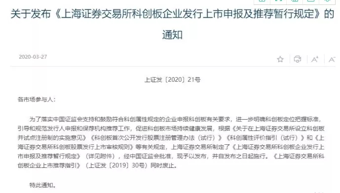 上海證券交易所科創板企業發行上市申報及推薦暫行規定